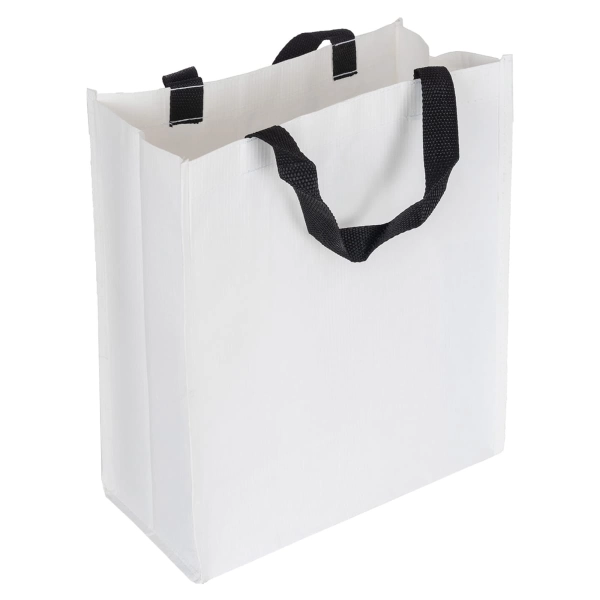 This warp and weft paper bag has cotton thread weaving into the paper fabric the thread reinforces the paper strength it is biodegradable waterproof and greaseproof. Tough and strong 2 black PP webbing handles.