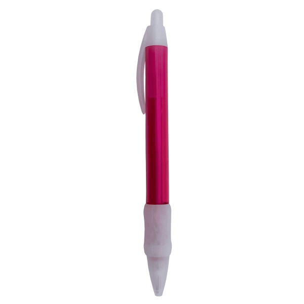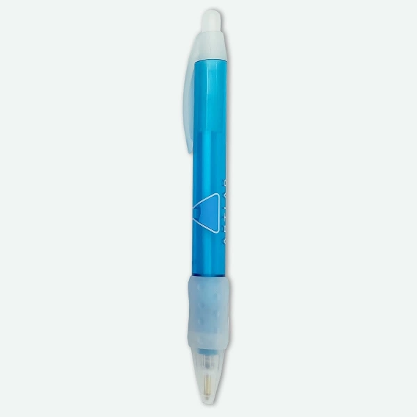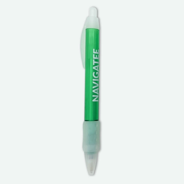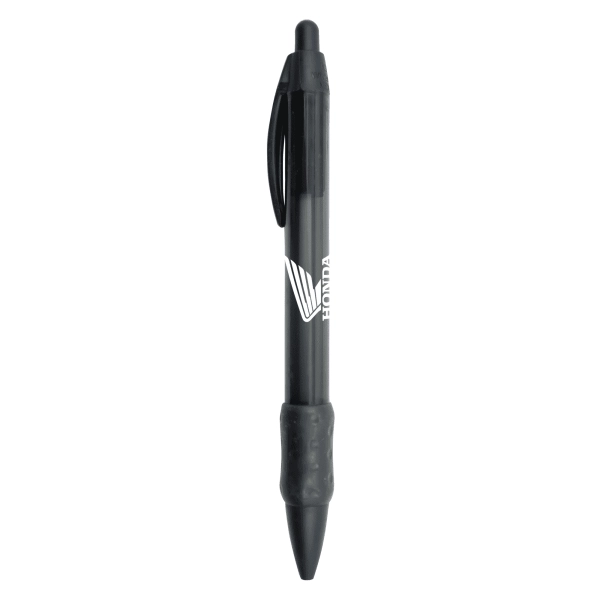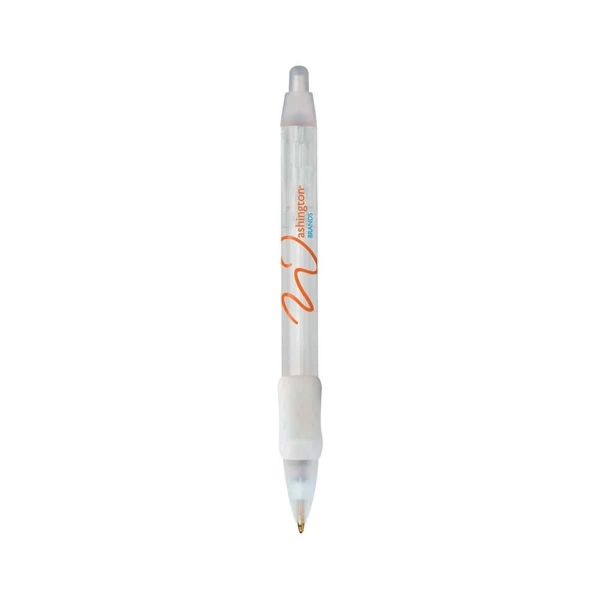 This wide-profile pen offers extra space for your branding to stand out loud and clear. A classic desk staple with a frosted clear trim, it delivers a clean look with solid promotional impact. Available with blue or black ink.