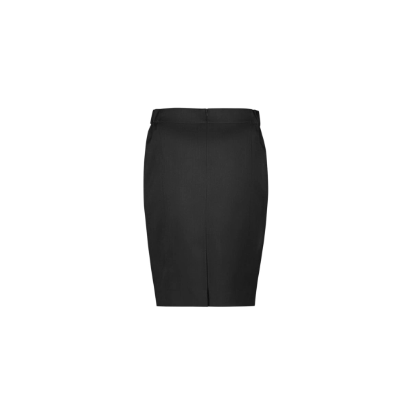 Features: A modern Cool Stretch mid-waist pencil skirt with encased elastic on waistband sides.