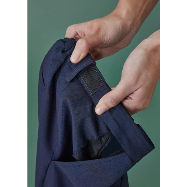 Fabric: Renew Suiting: 77% Recycled Polyester, 20% Viscose, 3% Elastane; A lightweight fabric that's engineered to be an easy-care, machine wash-and-wear fabric with minimal creasing. Made for ease and versatility for when you are on the go. A conscious product choice, with 77% made from post-consumer recycled polyester.