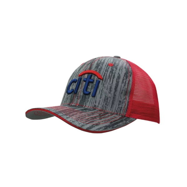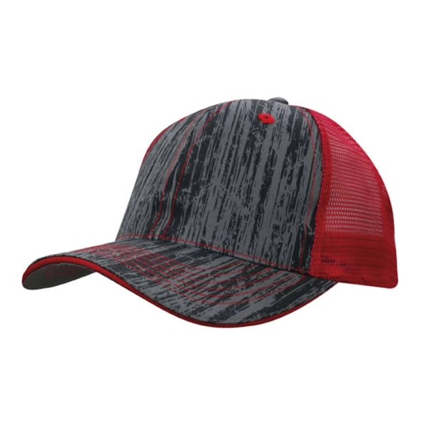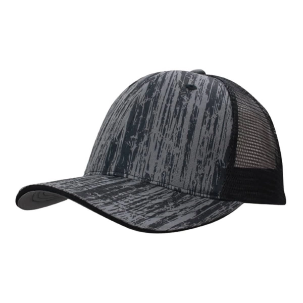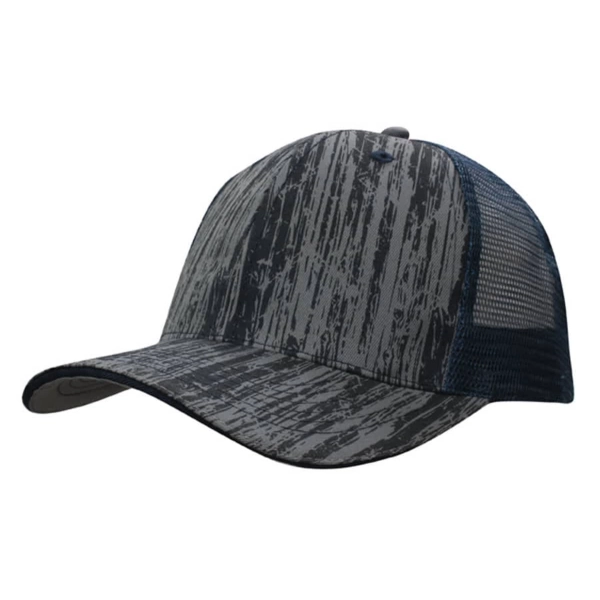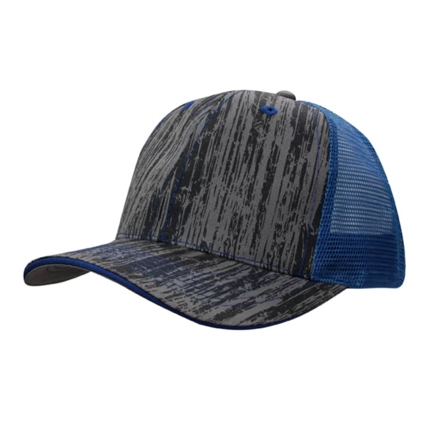 Show off a unique, natural vibe with this wood-printed cap, featuring a breathable mesh back for added comfort. The structured six-panel design provides a secure fit, while the pre-curved peak adds classic style. Finished with a fabric-covered short touch strap for easy adjustments, this cotton and mesh cap is perfect for outdoor adventures or casual everyday wear.