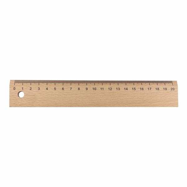20cm beech wood ruler is printed with black ink in centimetres natural beech wood produces the variances in the grain pattern colour and branding. It has a hole on one end for hanging on the wall and with one side graduation in centimetres.