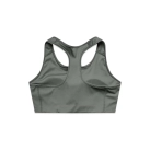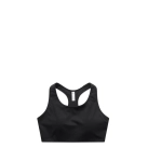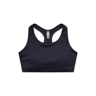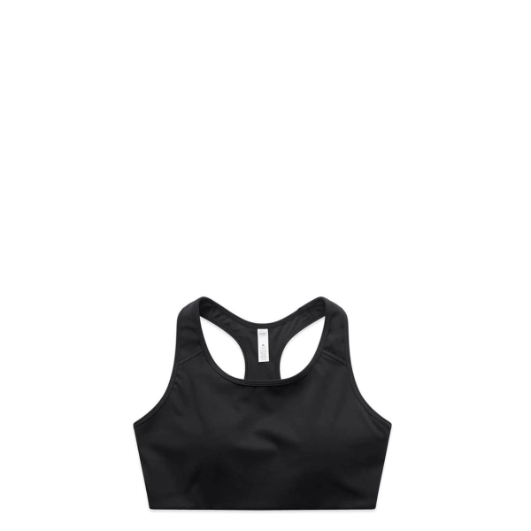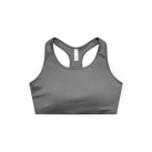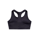 Matte finish, continuous removable bust cup, racer back, internal elastic, moisture wicking, quick drying, high elastane content for resilience, suitable for low to medium impact activities