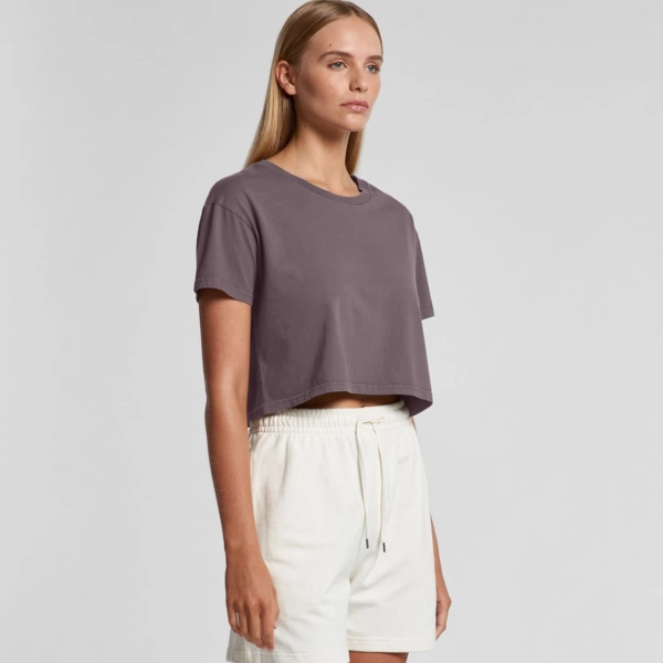 Short body, dropped shoulders, neck ribbing, side seamed, shoulder to shoulder tape, double needle hems, preshrunk to minimise shrinkage