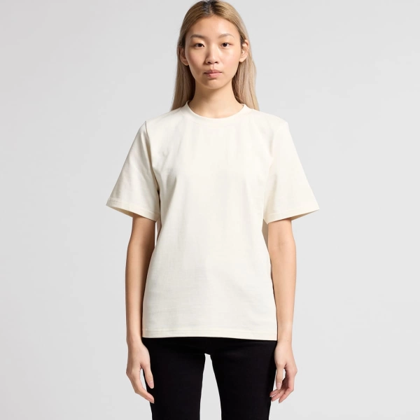 Get to know our AS Colour Women's Heavy Tee, built to last with heavy weight 280 GSM 100% carded cotton. A relaxed fit with dropped shoulders, wide neck ribbing, side seams, shoulder to shoulder tape, and double needle hems ensure street-ready durability and comfort.