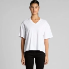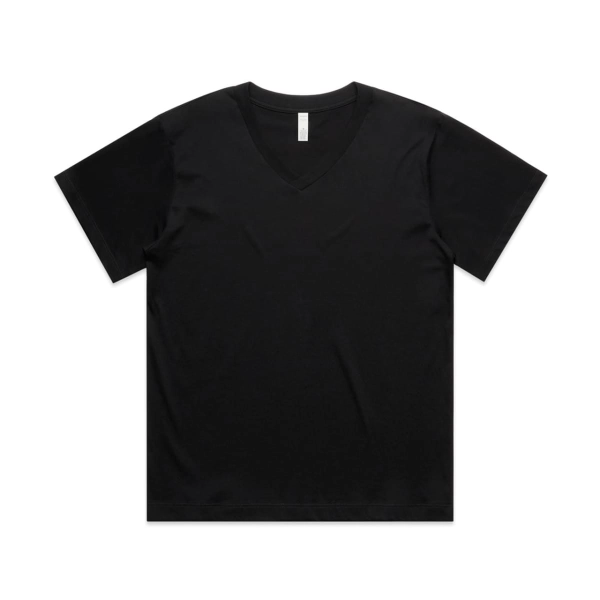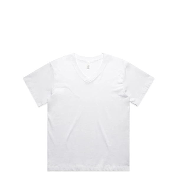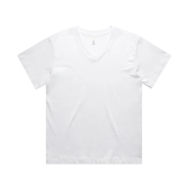 Neck ribbing in V shape, side seamed, shoulder to shoulder tape, double needle hems, drop shoulder, ribbed v-neck, mid length, preshrunk to minimise shrinkage