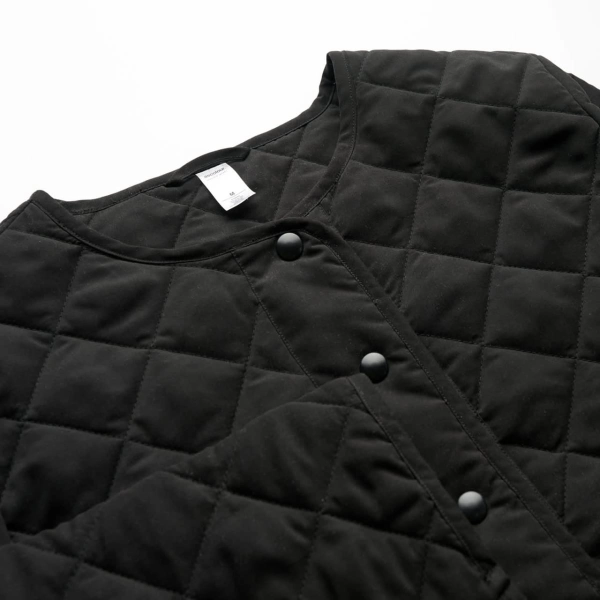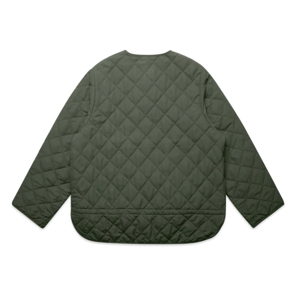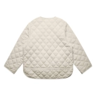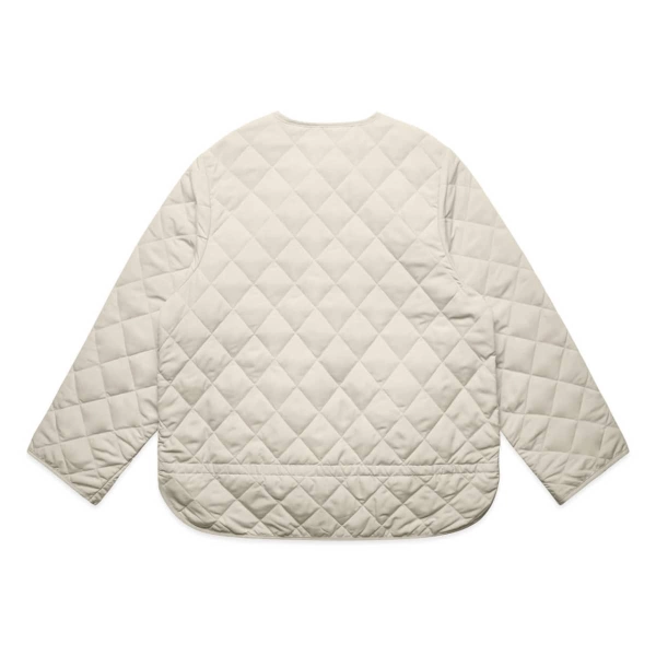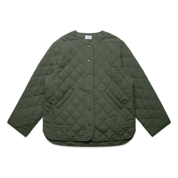 Showcasing the AS Colour Women's Quilted Jacket, featuring 100% recycled polyester wadding. Features a collareless design, snap dome closure, and two side pockets. Made sustainably, saving approximately 89 recycled 500ml plastic bottles from landfill.