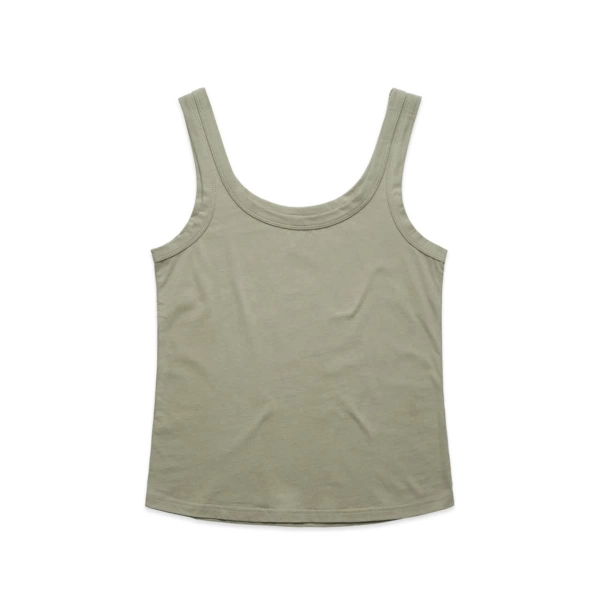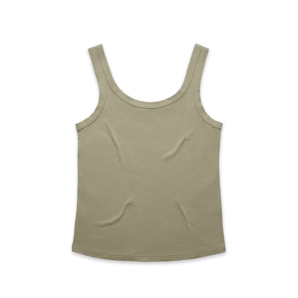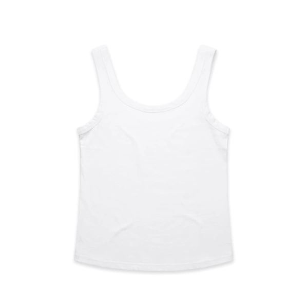 Bound neck and armholes, scoop neck, double needle hem, preshrunk to minimise shrinkage