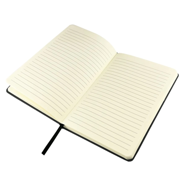 High quality medium size A5 notebook with a soft PU paper look cover. Comes with book mark ribbon and 96 leaves 192 pages of lined paper.