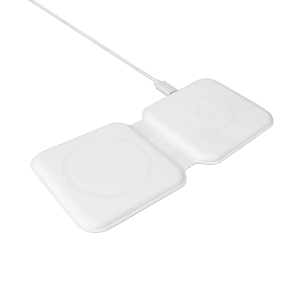 The York 2n1 magnetic wireless charger conveniently charges your compatible iPhone, iWatch, AirPods, and other Qi-certified devices. Lightweight and foldable, this dual wireless charging station charges two devices simultaneously and is ideal for travelling. Compatible with iPhone 12/12 Mini, 12 Pro/12 Pro Max, iPhone 11/11 Pro/11 Pro Max/X/XR, AirPods Pro/AirPods Pro 2, App Watch 6/SE/5/4/3/2/1. Includes a Type-C charge cable and user manual. Material: PU Leather.