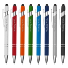 Retractable aluminium stylish design pen with a shiny silver chrome trim soft rubberised barrel in a range of colours and a stylus black top for touch screens. Click action with plastic Cross-Type German manufactured black ink refill 1200 meters writing distance tungsten carbide ball provides you with quality writing. Comes standard with black ink but blue ink is available on request at additional costs.