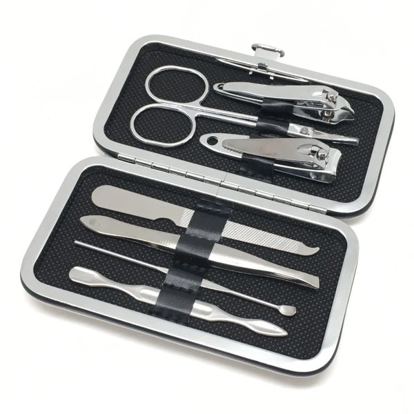 The seven-piece Zoel Manicure Set is designed to handle the most demanding of people's nail care. Each piece is manufactured from tempered stainless steel long lasting and durable. Supplied with a soft PU leather travel case a push button to open and close the case. It contains flat nail clippers oblique nail nipper double pick eyebrow scissor eyebrow tweezers ear pick and double side nail file. It is a great promotional product and portable carrying case for both travel and home storage.